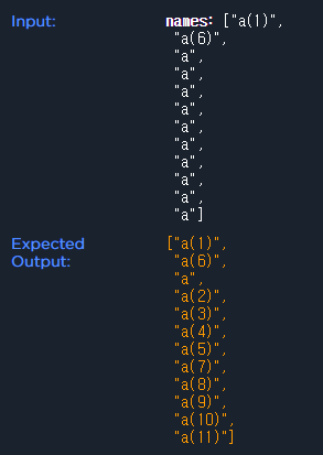 문자열 배열을 받아서 위에서 부터 차례대로 받는다고 생각하고, 입력된 문자열중에 같은 문자열이 있으면 문자열 끝에 '(1)'을 추가해준다. ex) a라는 문자열이 존재한 상태에서 a를 추가하면 새로 추가한 문자열은 a(1)이된다. 그 다음 다시 a를 넣으면 a가 있기 때문에 a(1)으로 바꿔준다. 그런데 또 a(1)이 있기 때문에 a(2)로 바꿔준다.