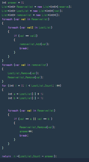 우선 차이점으로 중복된 값을 걸러내기위한 반복문을 사용하지않고 Linq기능을 사용하여 lost, reserve배열 서로 중복되지 않는 값만 입력받았도록 하고있다.