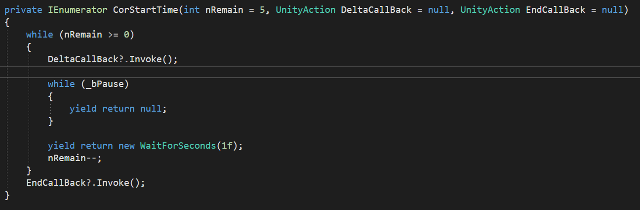 private IEnumerator CorStartTime(int nRemain = 5, Text txtTimer = null, UnityAction EndCallBack = null)