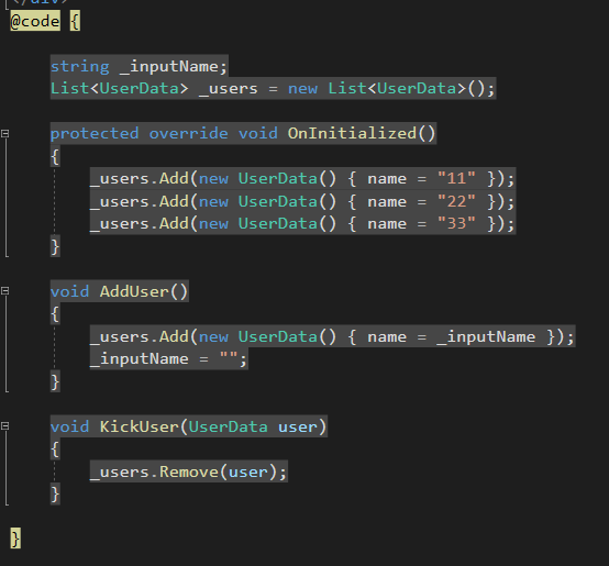 - <input class="form-control" placeholder="Add User" @bind-value="_inputName" : 처음에 뜨는 텍스트는 "Add User", "_inputName"을 바인딩 처리